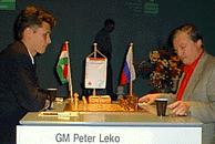 Runde 1:Als Auftakt des GM-Turnieres spielte Peter Leko (links) gegen den Vorjahressieger Wladimir Kramnik (rechts). Remis ist das Ergebnis.
